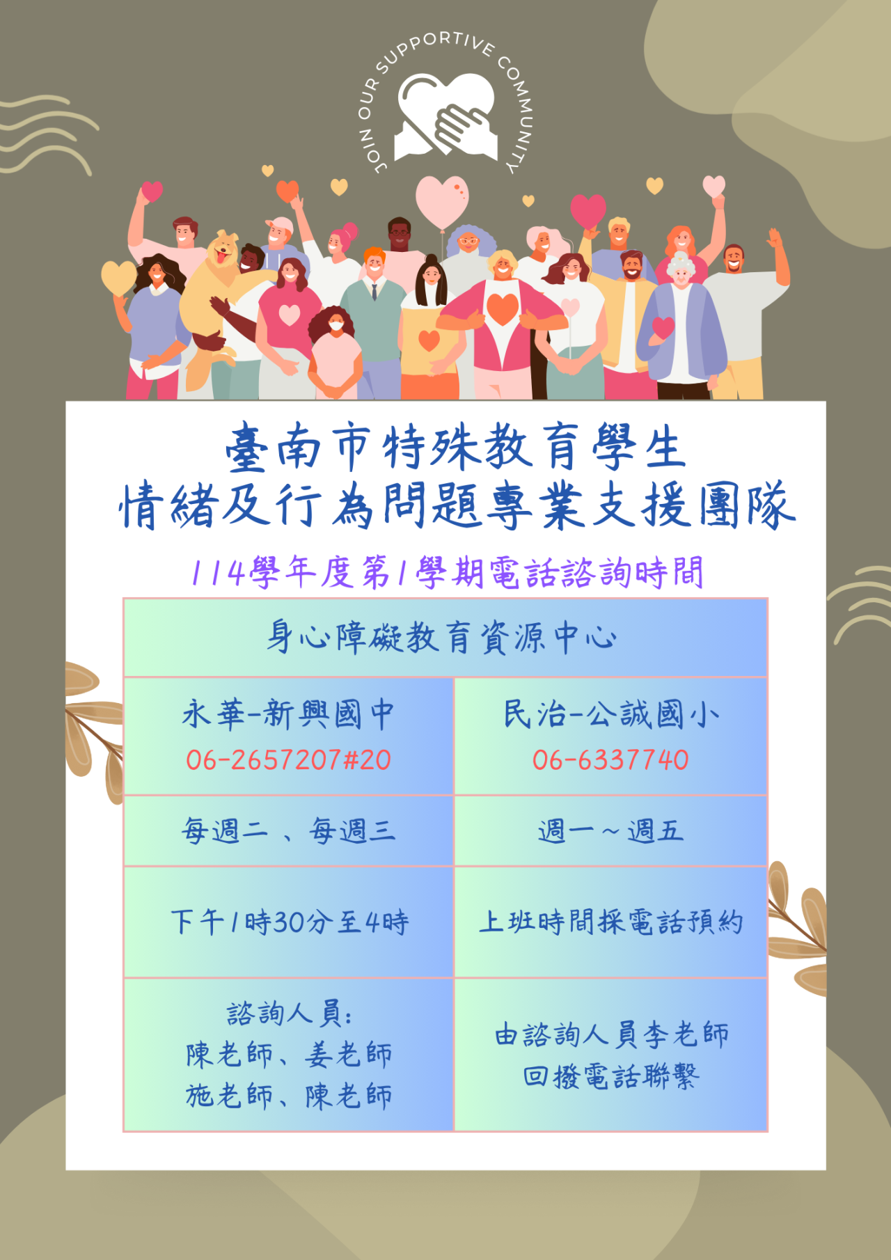 三、 114 學年度第 1 學期情支團隊電話諮詢時間如下: