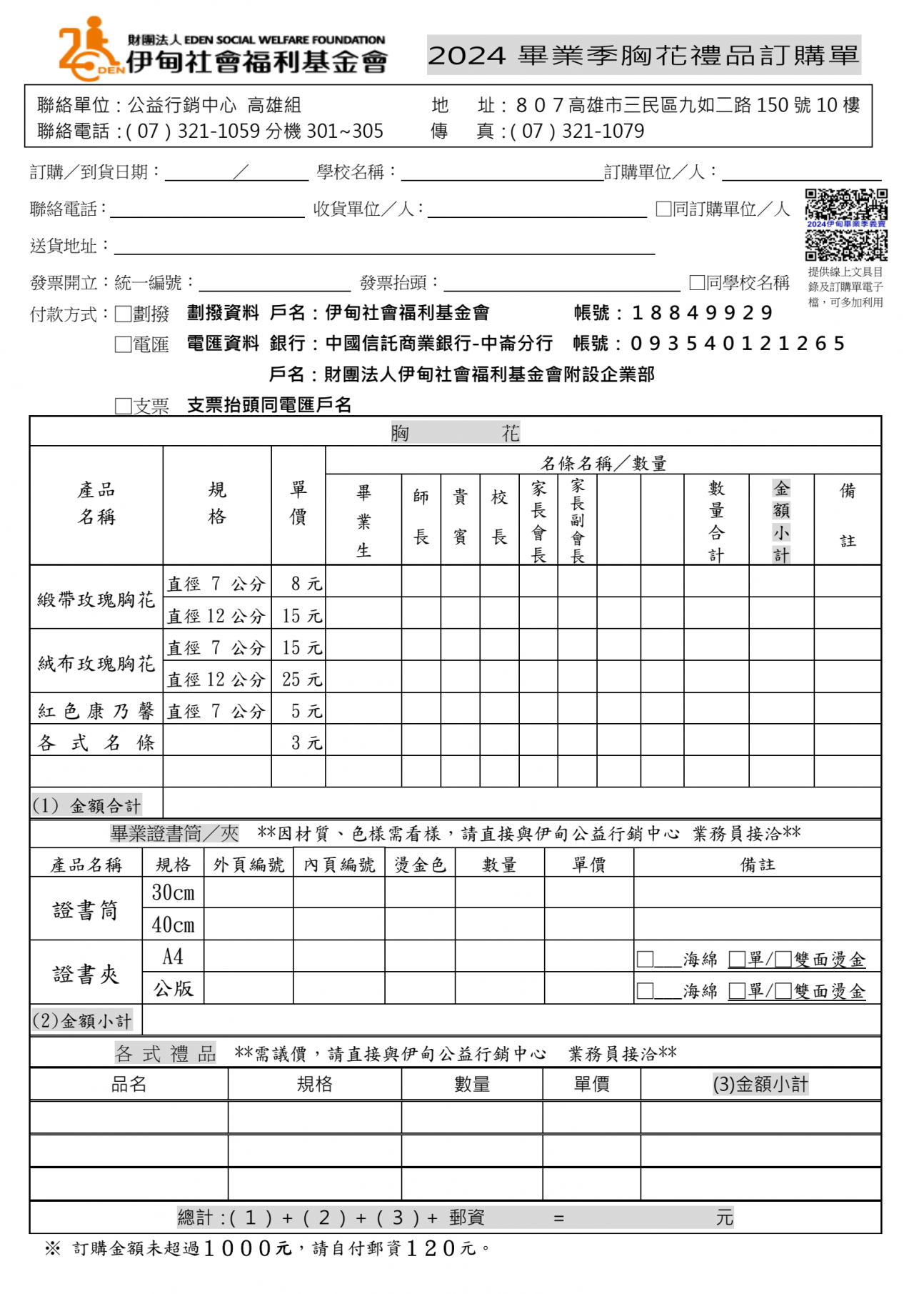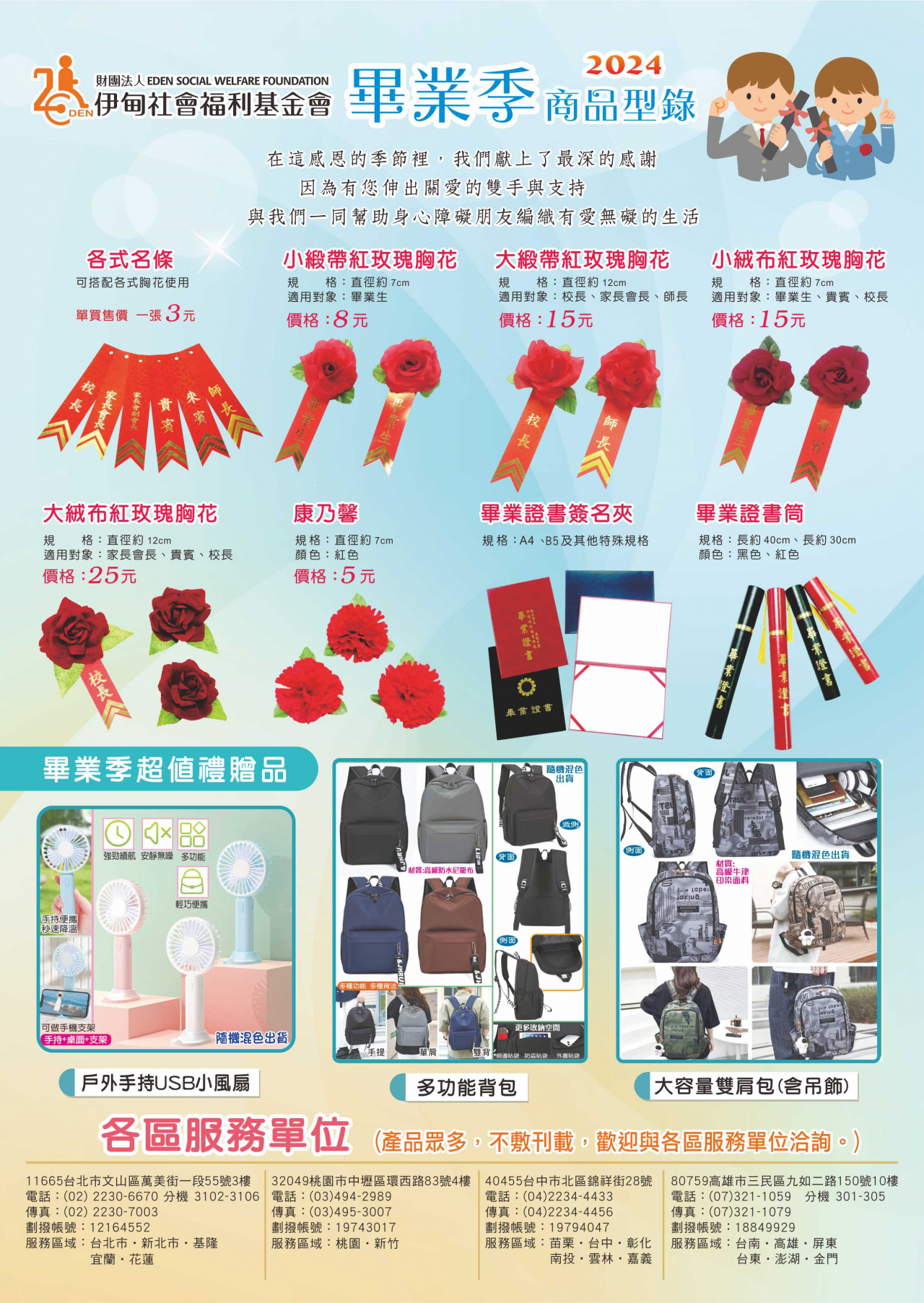 轉知轉知財團法人伊甸社會福利基金會辦理「伊甸2024年畢業季胸花及禮品」義賣活動,請查照。
