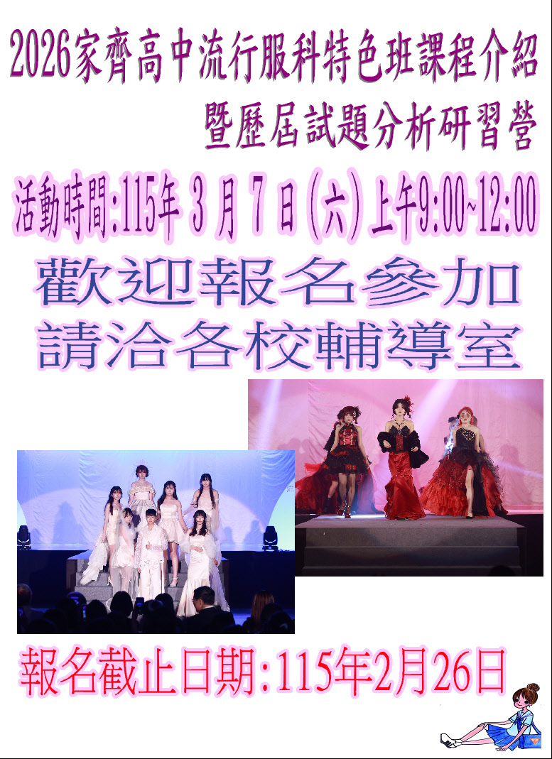二、謹訂於 115 年 3 月 7 日(週六)舉辦「流行服飾科特色班課程介紹暨歷屆試題分析」研習營。