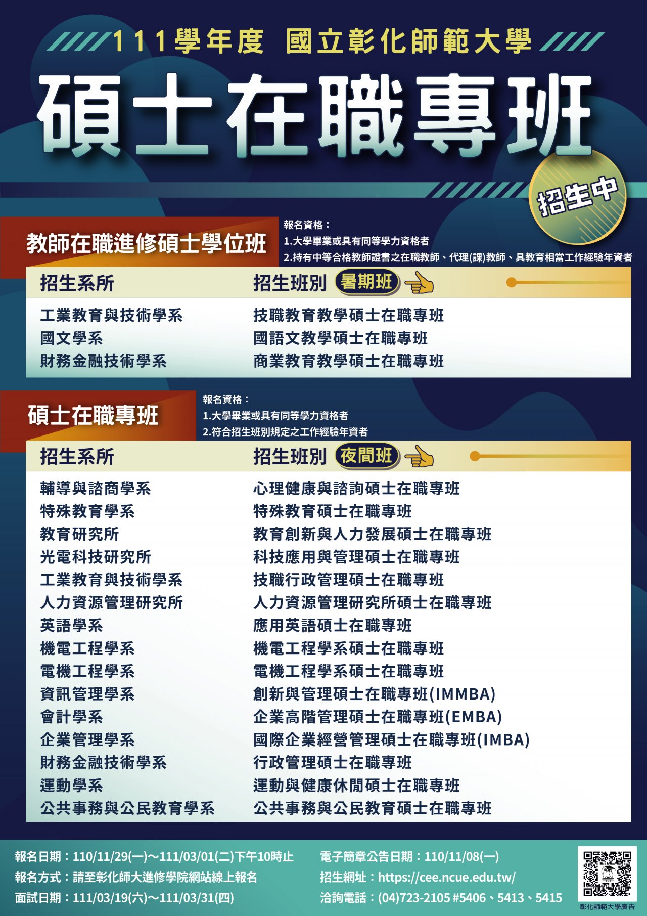 一、 111 學年度招生類別分為「教師在職進修碩士在職專班」及「碩士在職專班」,招生簡章請至國立彰化師範大學進修學院首頁免費下載( https://cee.ncue.edu.tw/)。