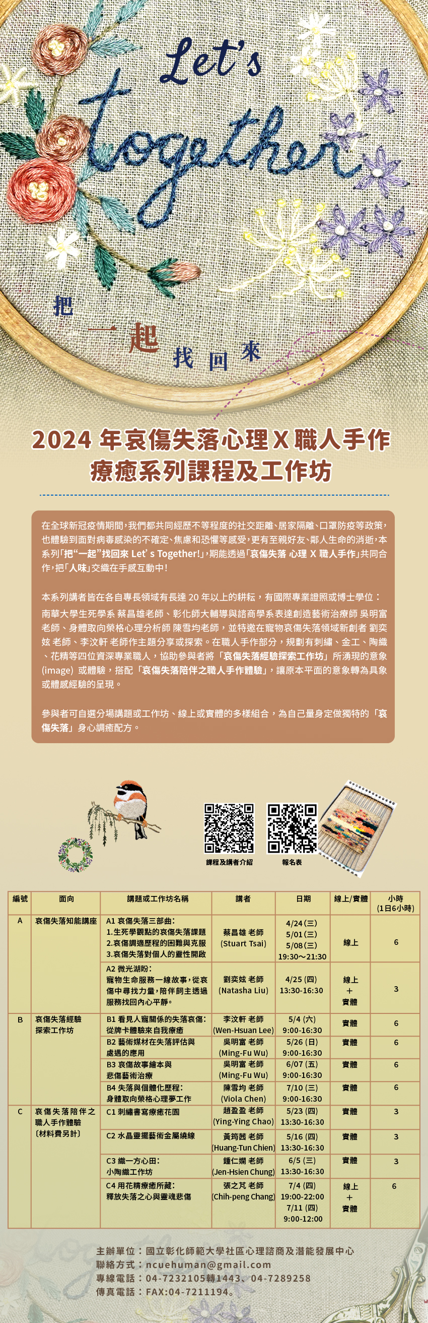(二)本系列講者皆在各自專長領域有長達 20 年以上的耕耘,有國際專業證照或博士學位:南華大學生死學系 蔡昌雄老師、彰化師大輔導與諮商學系表達創造藝術治療師 吳明富老師、身體取向榮格心理分析師 陳雪均老師,並特邀在寵物哀傷失落領域新創者 劉奕妶 老師、李汶軒 老師作主題分享或探索。在職人手作部分,規劃有刺繡、金工、陶織、花精等四位資深專業職人,協助參與者將「哀傷失落經驗探索工作坊」所湧現的意象(image)或體驗,搭配「哀傷失落陪伴之職人手作體驗」,讓原本平面的意象轉為具象或體感經驗的呈現。參與者可自選分場講題或工作坊、線上或實體的多樣組合,為自己量身定做獨特的「哀傷失落」身心調癒配方。
