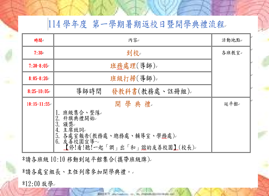 【學務處】114學年度第一學期返校日暨開學典禮流程