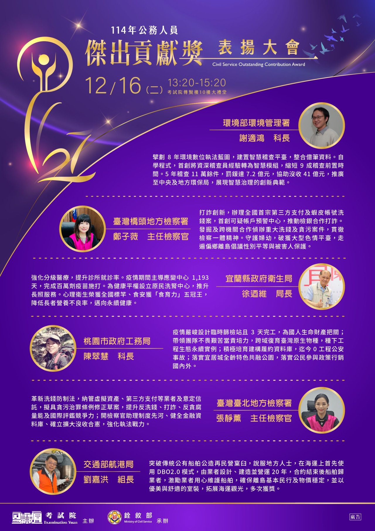 說明:本( 114 )年公務人員傑出貢獻獎業經考試院組成評審委員會議,決議 6 名得獎人及 6 組得獎團體,茲檢附「114 年公務人員傑出貢獻獎表揚大會」個人獎及團體獎電子海報各 1 份。