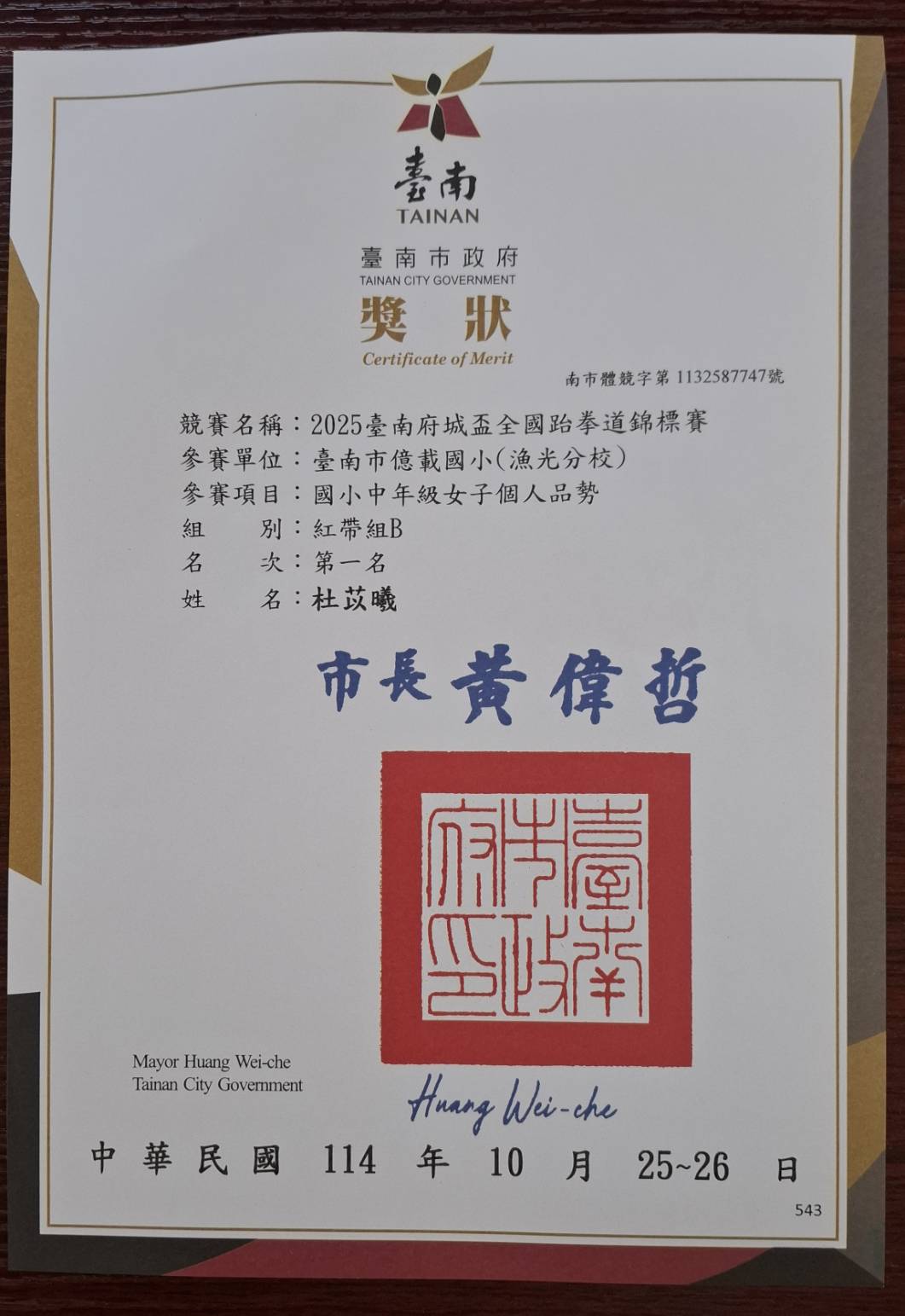 榮獲 2025 臺南府城盃全國跆拳道錦標賽-國小中年級女子個人品勢