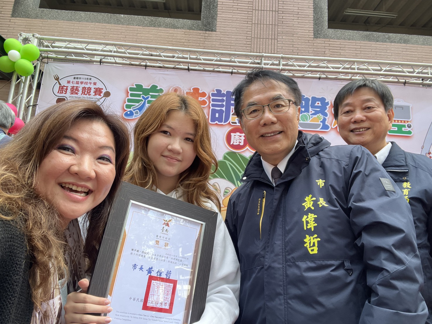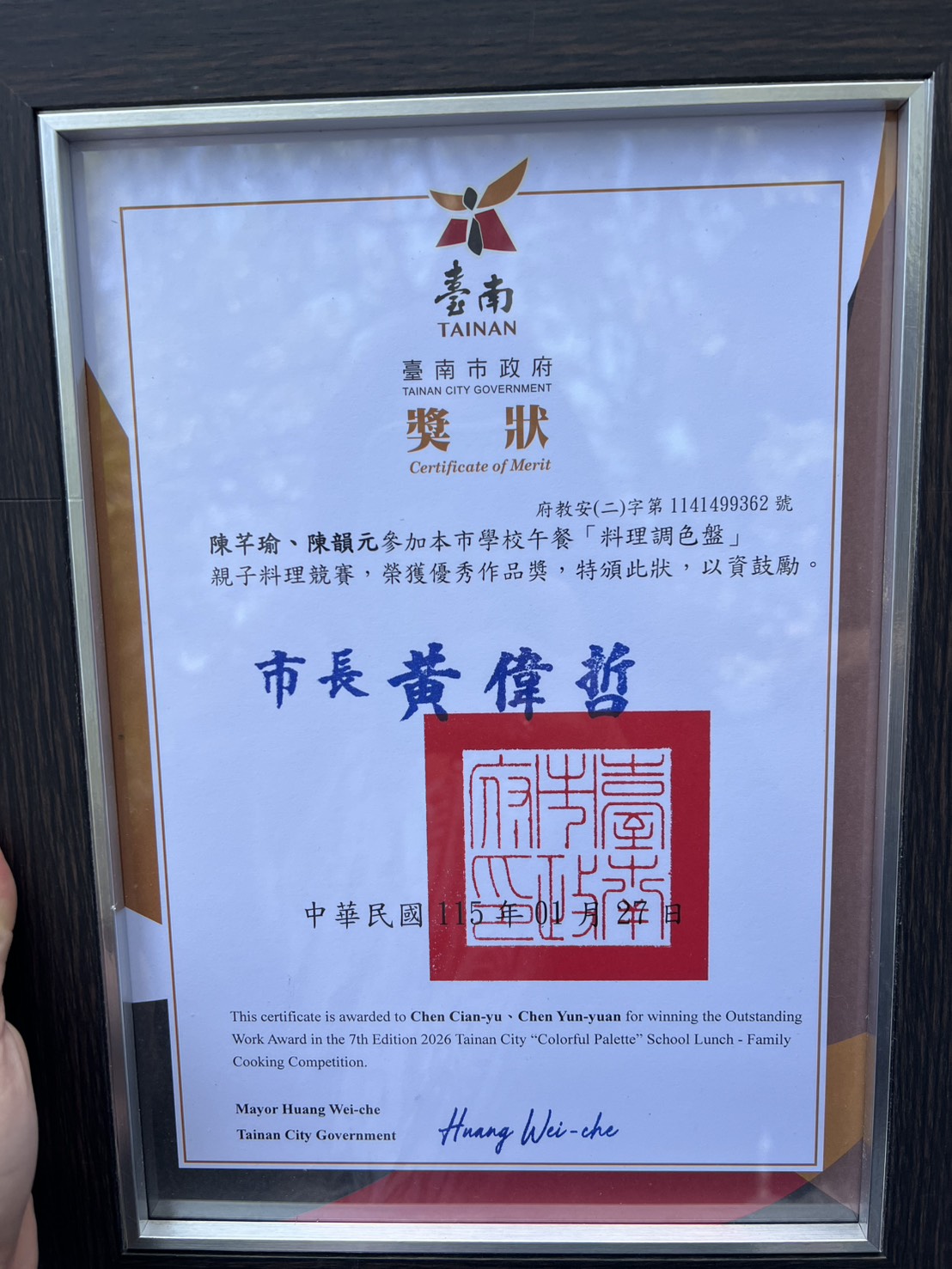 六年級陳芊瑜同學與家長組隊參加臺南市學校午餐料理調色盤親子料理競賽, 榮獲優秀作品 !