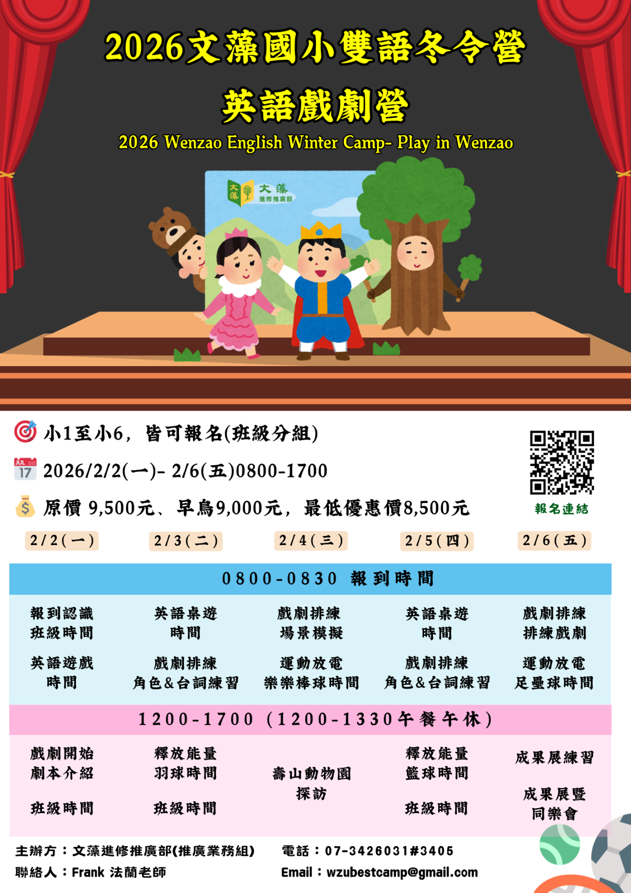 檢送文藻學校財團法人文藻外語大學辦理2026文藻國小雙語冬令營-英語戲劇營海報,敬請協助公告。 (陳義泰)