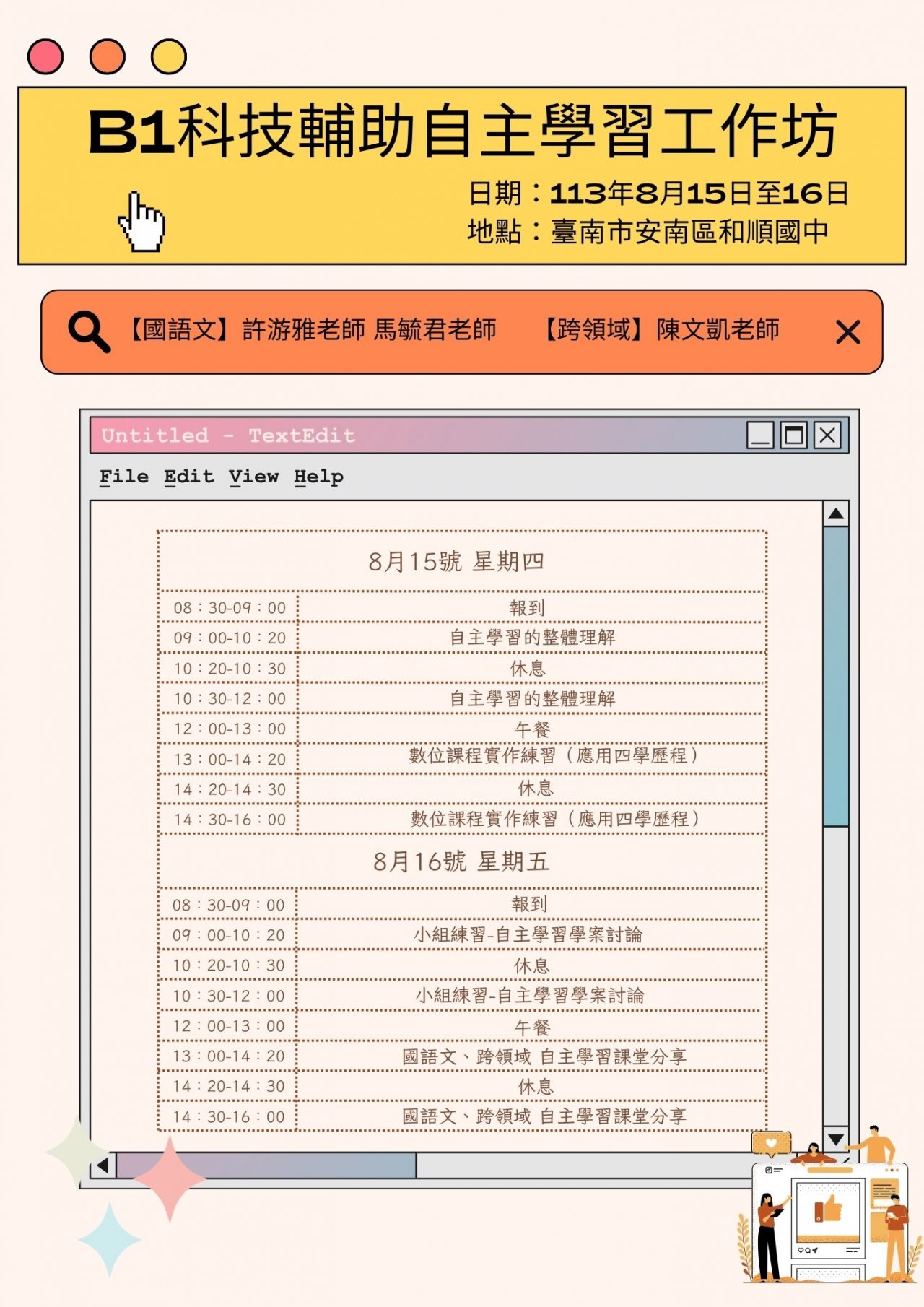 九、檢附【B1】科技輔助自主學習作坊課程表一份,敬請所屬學校鼓勵教師報名參與。