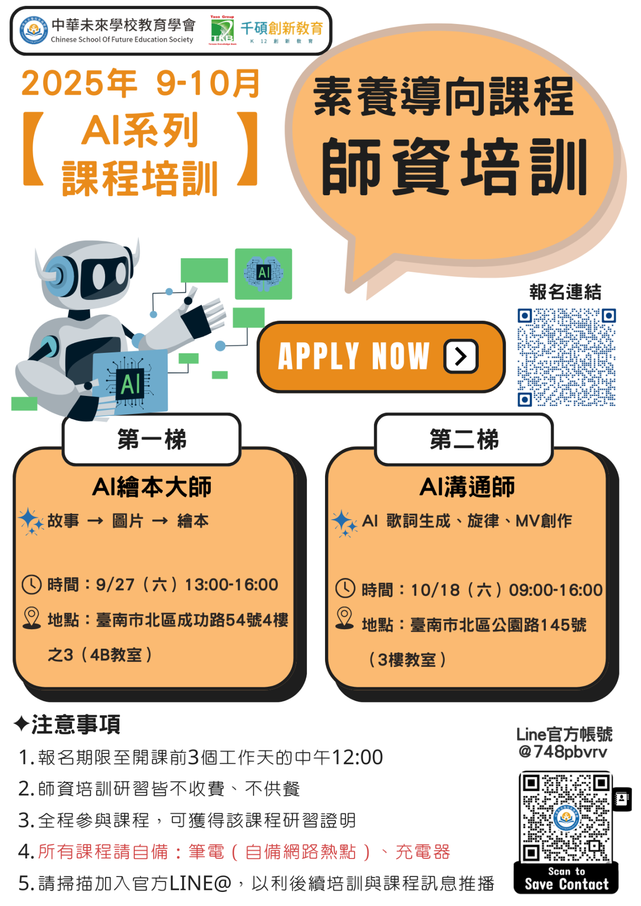 一、 隨著人工智慧快速發展, AI 素養已成為教育現場重要議題。為協助教師理解 AI 基礎原理及應用,提升跨領域應用與教學實務能力,本會規劃辦理「AI 系列教師增能研習(臺南場)」。