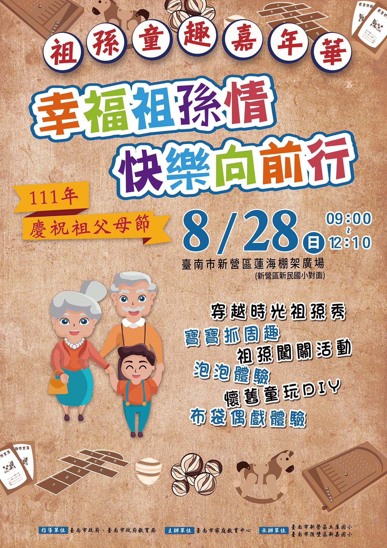 (三)  內容:穿越時光祖孫秀、寶寶抓周趣、祖孫闖關活動、懷舊童玩 DIY 、泡泡體驗、布袋戲偶體驗等,詳細內容及報名訊息請上「臺南市家庭教育中心」FB ( https://www.facebook.com/tainanfamily )查詢。