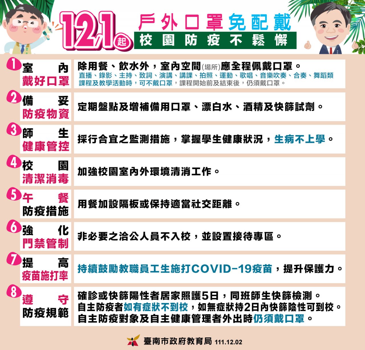 一、因應嚴重特殊傳染性肺炎中央流行疫情指揮中心公布自 111 年 12 月 1 日起適度放寬戴口罩等防疫措施,取消室外空間及室外場所應全程佩戴之限制,請各校(園)依教育部 111 年 11 月 30 日修正「高級中等以下學校及幼兒園因應嚴重特殊傳染性肺炎防疫管理指引」(本局 111 年 12 月 2 日南市教安(二)字第 1111565171 號函諒達),各項校園及教學活動之防疫工作。