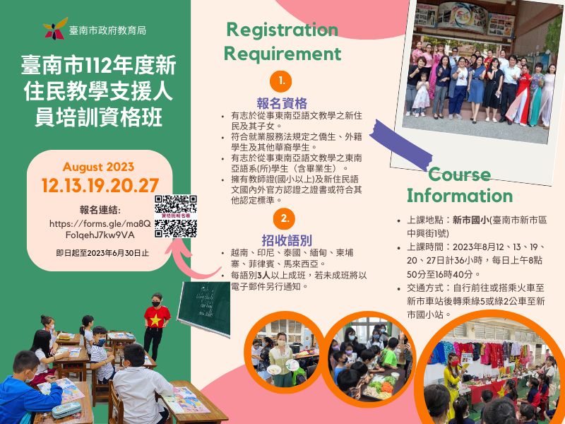 二、為培訓本市合格新住民語文教學支援人員,整備本市所轄國中小所需師資,特就東南亞 7 國語別(越南、印尼、泰國、緬甸、柬埔寨、菲律賓及馬來西亞)開設資格班(36 小時)1 場次,請貴單位協助宣傳公告。