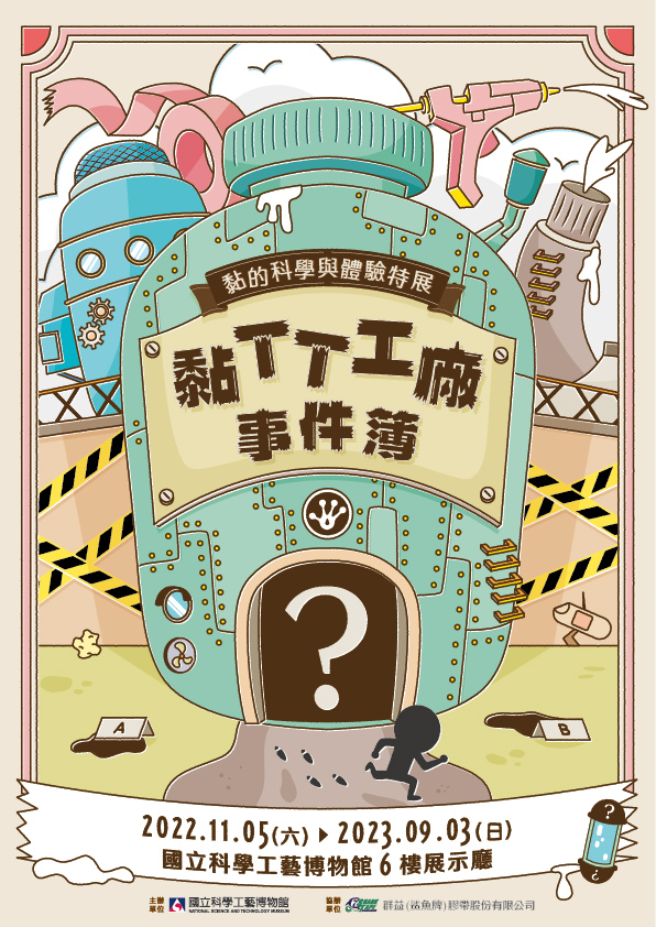 (三)展覽介紹:大小朋友將化身偵探,親身走入故事場景,來到工廠調查案件。依循偵查手冊引導,以掌握事件開端及關鍵人物,利用科學「黏」理,體驗黏、觸碰黏、踏上黏、實驗黏,完成偵查解密任務。