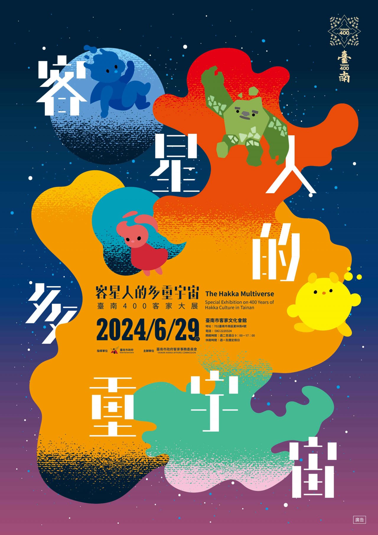 一、本展覽打破、顛覆傳統客家既有印象以「打造當代的臺南客家&最好玩的客家主題特展」的策展核心目標,搭配主題性的互動展覽設計,在展覽中融入客家語言體驗、相關產業推廣、當代百工百業客家人物特質展示,搭配活動推廣及體驗,建立有趣、好玩、吸引人的客家展覽,歡迎踴躍參加。