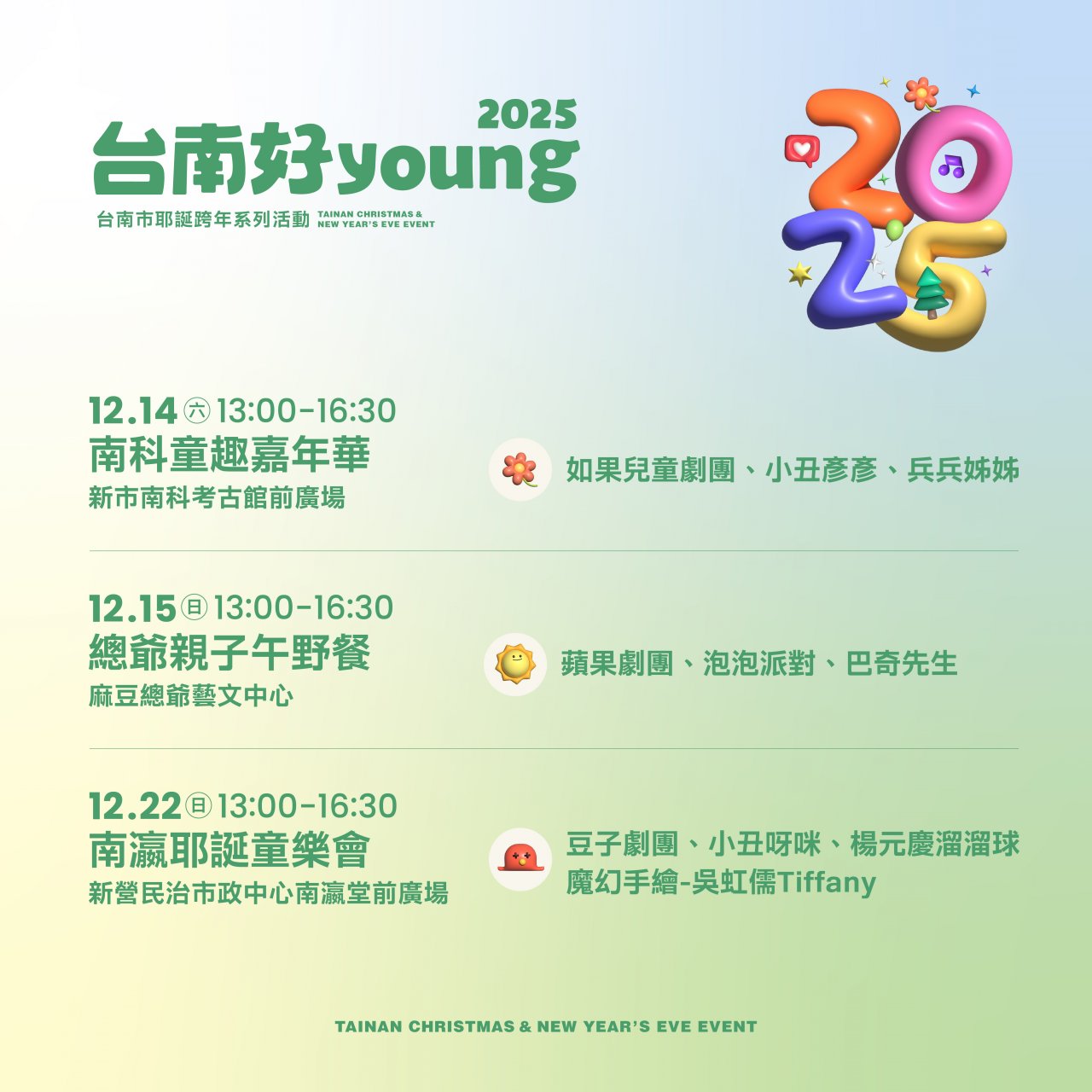 二、針對本府舉辦「2025 臺南市耶誕跨年系列活動」一案,請貴校(園)事先向教職員及家長宣導周知,並公告於網頁或臉書中,以利民眾參與,說明如下: