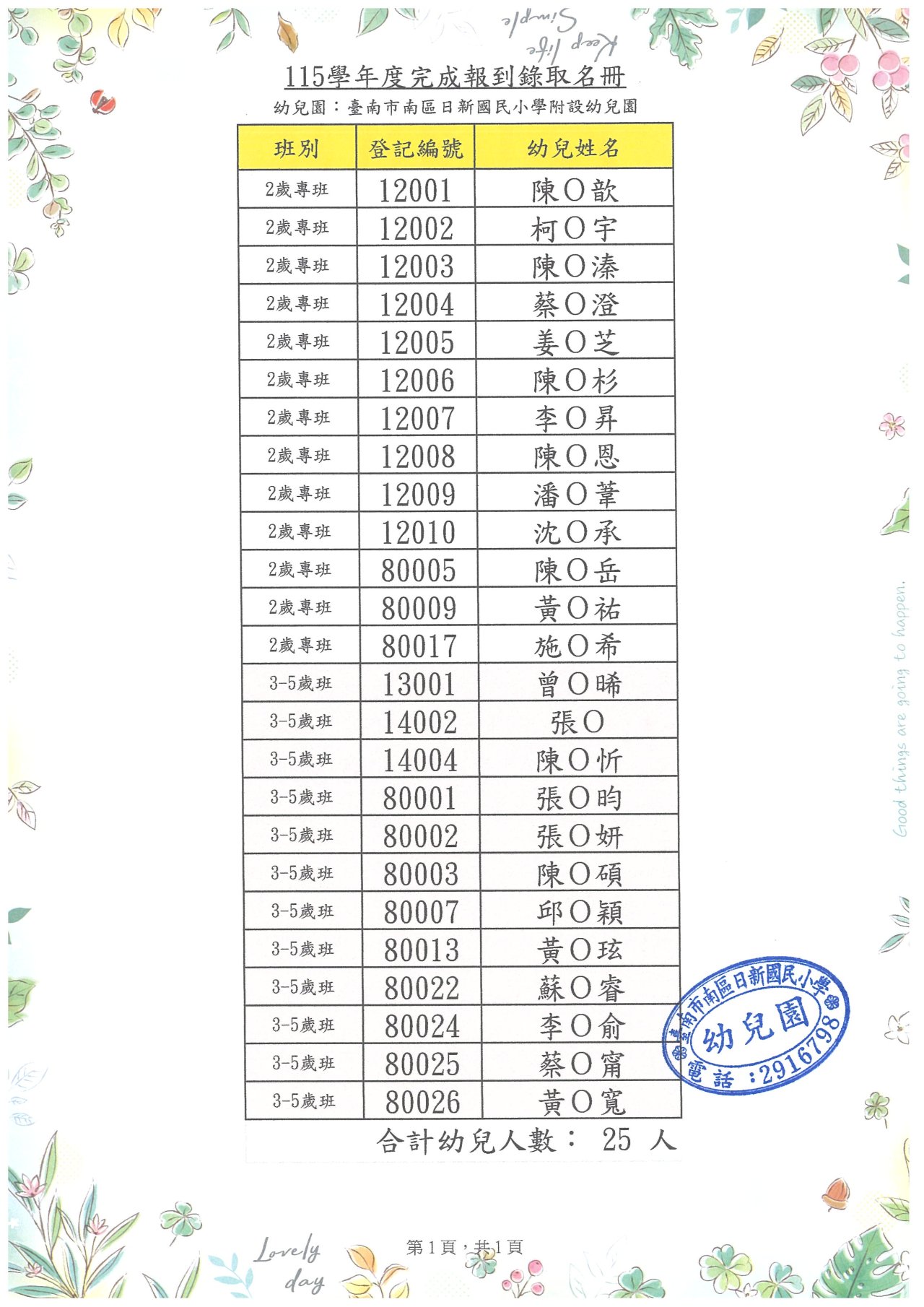 本校附設幼兒園 115 學年度新生完成報到名冊