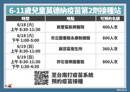 6-11 歲兒童莫德納疫苗第 2 劑,自即日起可透過台南打疫苗系統預約